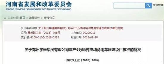 为加快河南省新能源汽车产业发展,相关人士从河南省发改委获悉,郑州宇通集团有限公司年产6万辆纯电动商用车建设项目已经获批。