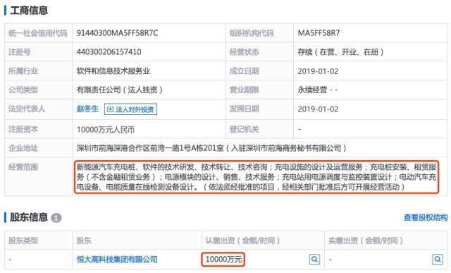 恒大集团在新能源汽车领域的投资布局已是“停不下来”的节奏。近日我们从工商信息获悉,恒大高科技集团于1月2日出资设立了“恒大智慧充电科技有限公司”,注册资本1亿元。