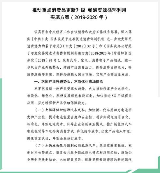 汽车已经成为国民重要的经济支柱产业,同时也成为消费者的大件消费产品,并能快速拉动国内经济。日前,网通社从国家发改委获悉:《推动重点消费品更新升级 畅通资源循环利用实施方案(2019-2020年)》,提出各地不得对新能源汽车实行限行、限购,已实行的应当取消。