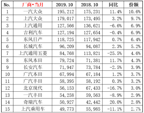 车企排名方面,“南北大众”表现依然十分强势,牢牢抢占**二名位置。在多数车企沉陷同比下滑的同时,一汽大众和上汽大众在10月分别交付19.5万辆和17.9万辆新车,同比上涨11.4%和3.2%,实现逆势增长。从市场份额来看,“南北大众”更是占据了超过20%的市场份额。