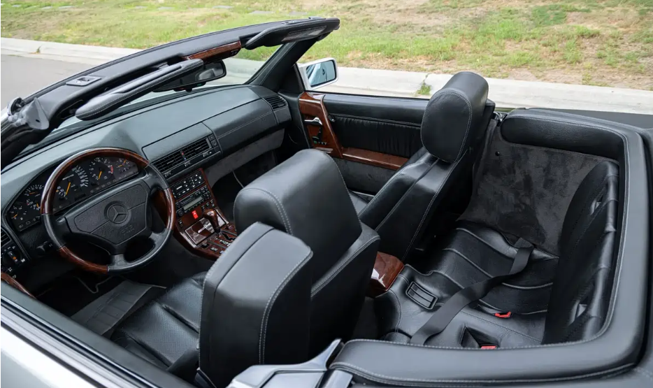 这辆SL 72 AMG于30年前被日本东京的ART Sports进口并售出,该车一直登记在第一任车主名下,直到2025年才被美国亚利桑那州的二手车经销商收购。这辆车采用亮银色金属漆,除了黑色软顶外,还配有与车身同色的可拆卸硬顶。 由OZ Racing打造的17英寸AMG Aero III轮圈让它在一众同时期SL(R129)中显得格外与众不同。据第一任车主透露,该车曾于2003年重新喷漆。